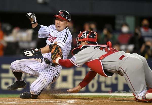 14일 서울 잠실야구장에서 ‘2022 신한은행 MY CAR KBO리그’ SSG 랜더스와 LG 트윈스 경기가 열렸다. 6회말 2사 2루 LG 안타 때 2루주자 서건창이 홈까지 달렸으나 아웃되고 있다.