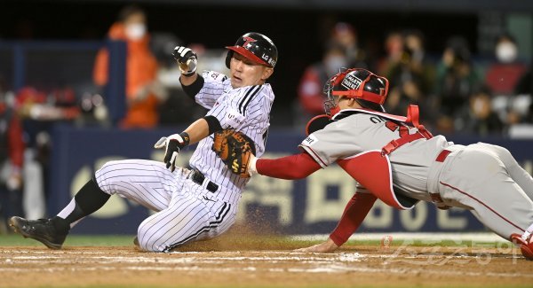 14일 서울 잠실야구장에서 ‘2022 신한은행 MY CAR KBO리그’ SSG 랜더스와 LG 트윈스 경기가 열렸다. 6회말 2사 2루 LG 안타 때 2루주자 서건창이 홈까지 달렸으나 아웃되고 있다.