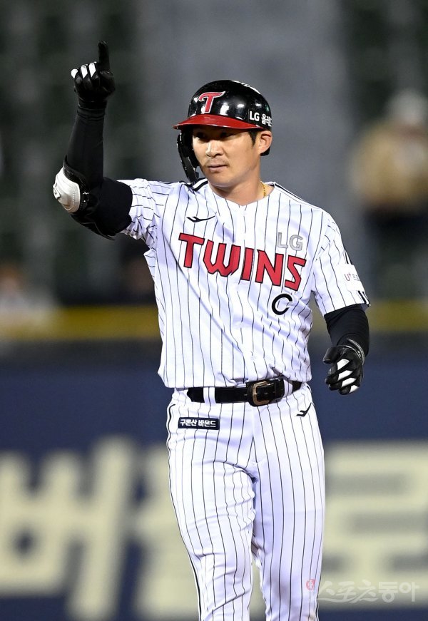 14일 서울 잠실야구장에서 ‘2022 신한은행 MY CAR KBO리그’ SSG 랜더스와 LG 트윈스 경기가 열렸다. 6회말 무사 LG 오지환이 중전 2루타를 2루에서 기뻐하고 있다.