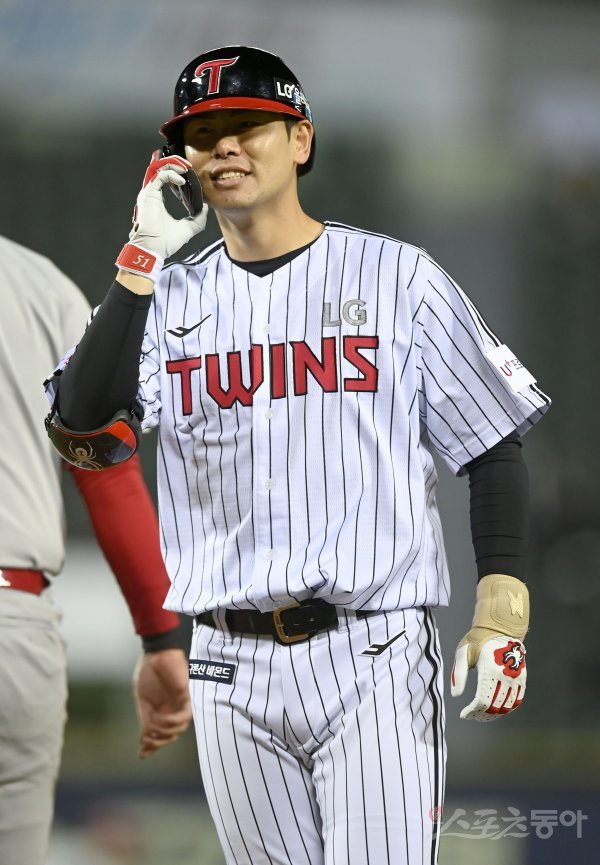14일 서울 잠실야구장에서 ‘2022 신한은행 MY CAR KBO리그’ SSG 랜더스와 LG 트윈스 경기가 열렸다. 6회말 1사 1,3루 LG 홍창기가 1타점 외야 뜬공을 친 후 웃고 있다.