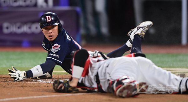 14일 경기도 수원KT위즈파크에서 열린 ‘2022 신한은행 SOL KBO리그’ KT 위즈와 두산 베어스의 경기에서 7회초 2사 1, 2루 두산의 좌전 안타 때 2루주자 허경민이 KT 포수의 실책을 틈타 홈으로 파고들어 세이프 되고 있다.