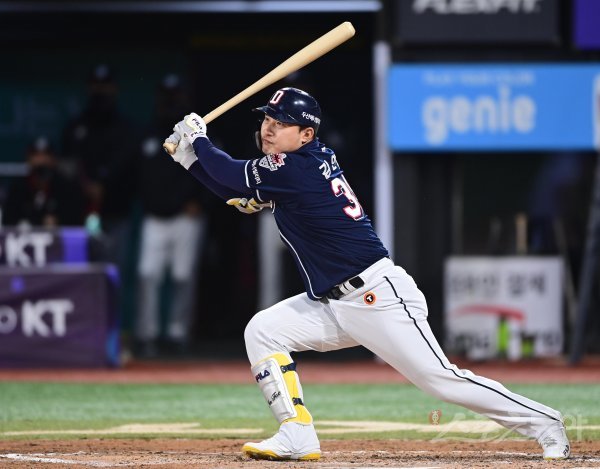 14일 경기도 수원KT위즈파크에서 열린 ‘2022 신한은행 SOL KBO리그’ KT 위즈와 두산 베어스의 경기에서 7회초 2사 3루 두산 김인태가 좌전 1타점 적시타를 치고 있다.