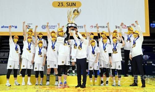 14일 충남 아산이순신체육관에서 열린 ‘삼성생명 2021-2022 여자프로농구’ 아산 우리은행과 청주 KB의 챔프전 경기에서 KB가 우승을 차지한 후 기념촬영을 하고 있다.
