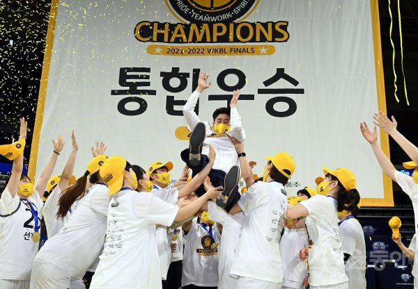 14일 충남 아산이순신체육관에서 열린 ‘삼성생명 2021-2022 여자프로농구’ 아산 우리은행과 청주 KB의 챔프전 경기에서 KB가 우승을 차지한 후 김완수 감독이 헹가래를 받고 있다.