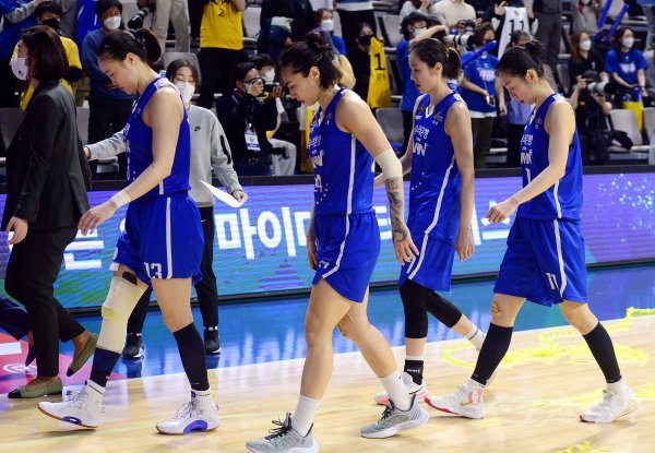 14일 충남 아산이순신체육관에서 열린 ‘삼성생명 2021-2022 여자프로농구’ 아산 우리은행과 청주 KB의 챔프전 경기에서 KB에 패하며 준우승을 차지한 우리은행 선수들이 코트를 빠져나가고 있다.
