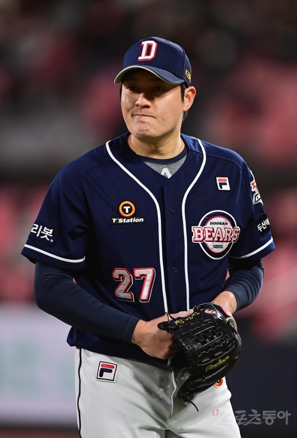 14일 경기도 수원KT위즈파크에서 열린 ‘2022 신한은행 SOL KBO리그’ KT 위즈와 두산 베어스의 경기에서 8회말 동점을 허용한 두산 김강률이 수비를 마친 뒤 아쉬워하고 있다.