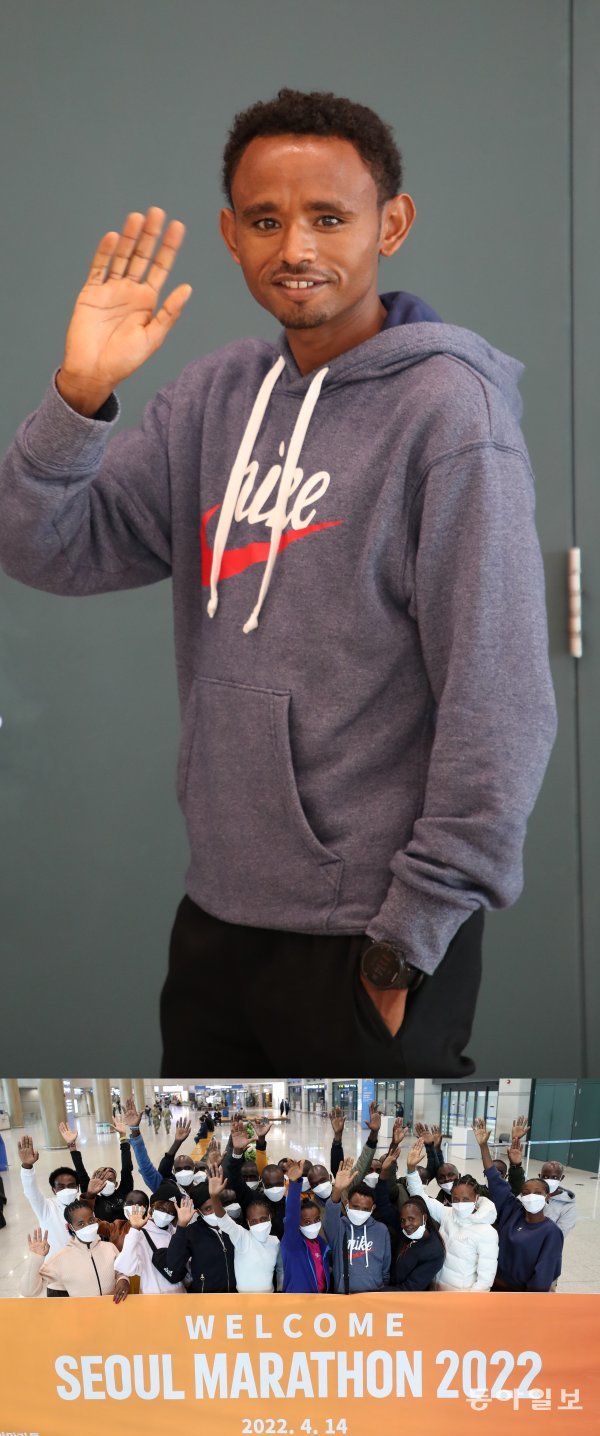“맡겨놓은 10만 달러 찾으러 왔다!” 역대 세계 남자마라톤 랭킹 4위인 에티오피아의 모시네트 게레메우 바이(30)가 17일 열리는 2022 서울마라톤에 출전하기 위해 14일 인천공항을 통해 한국에 왔다. 바이는 2019 런던마라톤에서 2시간2분55초로 준우승을 차지했으며 이번 대회 출전자들 중 가장 좋은 기록의 보유자다. 바이가 2시간5분대 이내로 결승선을 통과하면 상금 10만 달러를 받게 된다. 바이가 한국에 입국한 직후 선전을 다짐하며 포즈를 취하고 있다. 아래 사진은 2022 서울마라톤 국제 초청선수들이 입국 후 인천공항에서 ‘파이팅!’을 외치는 모습.
