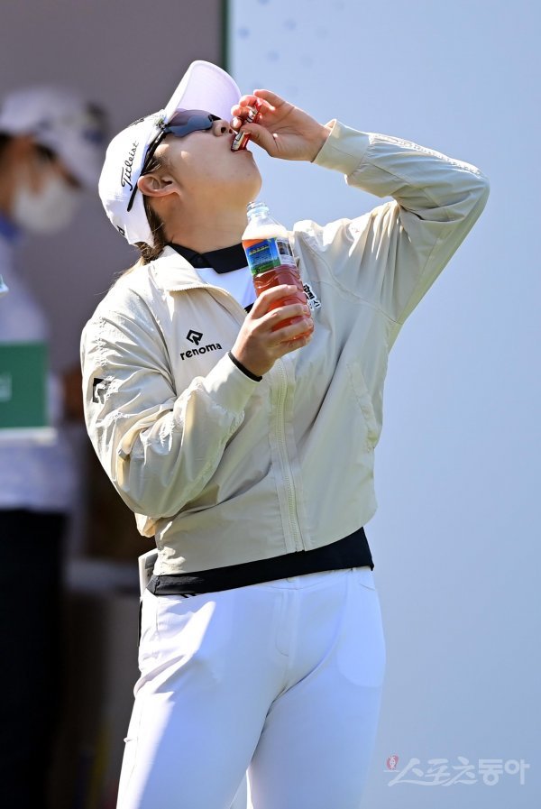 17일 경기도 여주 페럼클럽에서 열린 2022 KLPGA 투어 ‘메디힐-한국일보 챔피언십’ 파이널 라운드 1번홀에서 마다솜이 티샷에 앞서 비타민을 먹고 있다.