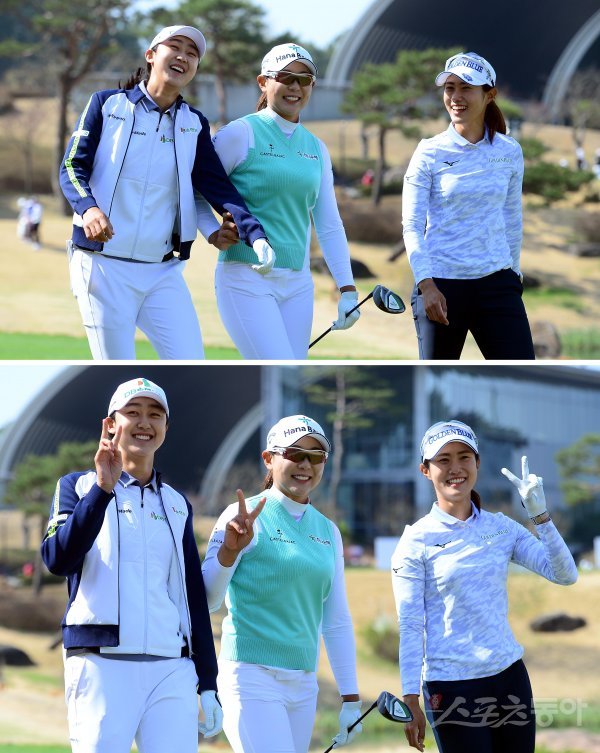 17일 경기도 여주 페럼클럽에서 열린 2022 KLPGA 투어 ‘메디힐-한국일보 챔피언십’ 파이널 라운드 1번홀에서 티샷을 마친 전우리, 박보겸, 이주미가 취재진을 향해 포즈를 취하고 있다.