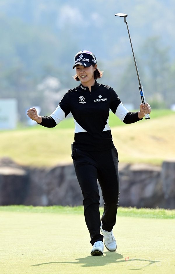 17일 경기도 여주 페럼클럽에서 열린 2022 KLPGA 투어 ‘메디힐-한국일보 챔피언십’ 파이널 라운드에서 박지영이 18번홀에서 버디 퍼트를 성공한 뒤 기뻐하고 있다.