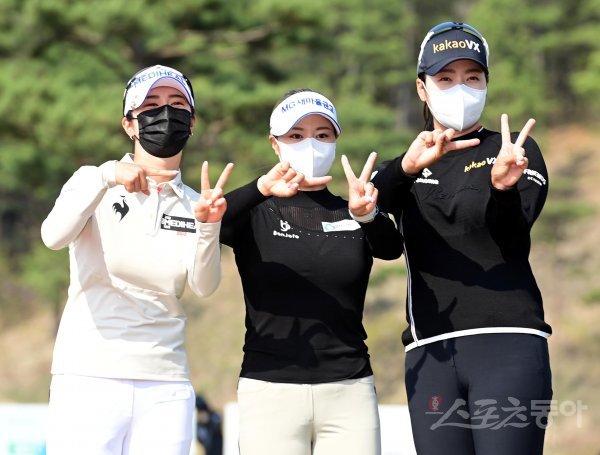 17일 경기도 여주 페럼클럽에서 열린 2022 KLPGA 투어 ‘메디힐-한국일보 챔피언십’ 파이널 라운드에서 김재희, 김리안, 한진선이 홀인원상을 수상해 기념 촬영을 하고 있다.