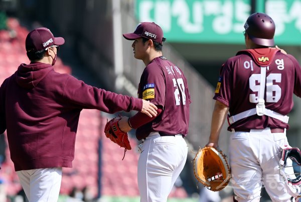 17일 서울 잠실야구장에서 ‘2022 신한은행 SOL KBO리그’ 두산 베어스와 키움 히어로즈의 경기가 열렸다. 4회말 2사 1, 2루에서 키움 최원태가 교체되고 있다.