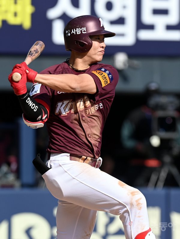 17일 서울 잠실야구장에서 ‘2022 신한은행 SOL KBO리그’ 두산 베어스와 키움 히어로즈의 경기가 열렸다. 5회초 무사 1, 2루에서 키움 송성문이 1타점 적시타를 날리고 있다.