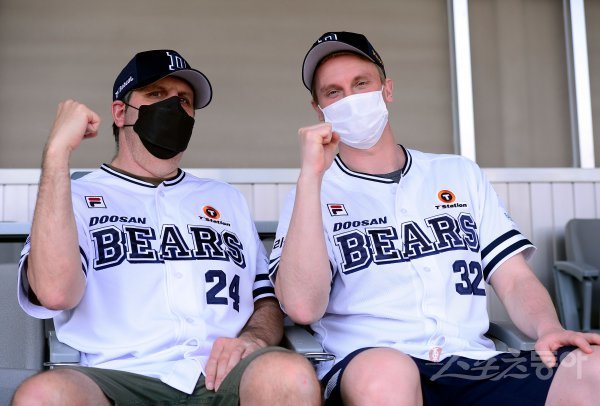 17일 서울 잠실야구장에서 ‘2022 신한은행 SOL KBO리그’ 두산 베어스와 키움 히어로즈의 경기가 열렸다. 니퍼트 전 미국대사와 토미 틸리카이넨 대한항공 감독이 야구장을 찾아 포즈를 취하고 있다.