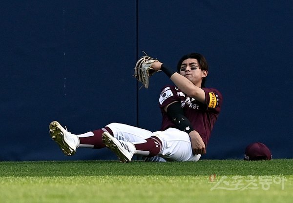 17일 서울 잠실야구장에서 ‘2022 신한은행 SOL KBO리그’ 두산 베어스와 키움 히어로즈의 경기가 열렸다. 7회말 무사 1루에서 키움 이정후가 플라이 타구를 넘어지며 잡아내고 있다.