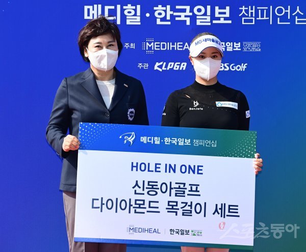 17일 경기도 여주 페럼클럽에서 열린 2022 KLPGA 투어 ‘메디힐-한국일보 챔피언십’ 시상식에서 김리안이 김순미 KLPGA 수석부회장으로부터 홀인원상을 수상해 기념 촬영을 하고 있다.