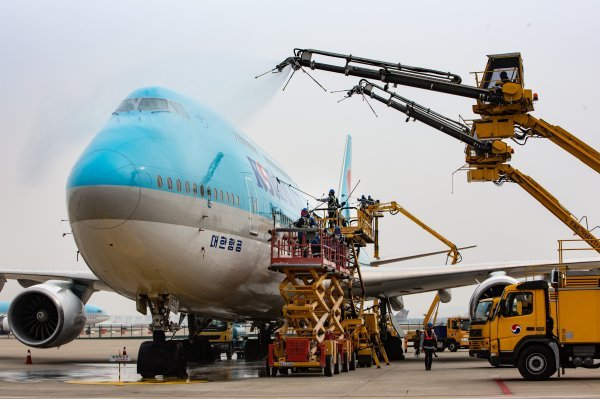 대한항공은 18일 인천국제공항의 정비 격납고에서 항공기 세척 행사를 실시했다. 대한항공은 고객 서비스 만족도 향상과 ESG경영의 일환으로 정기적으로 항공기 세척 작업을 진행하고 있다. 이날 행사는 항공 여행을 다시 시작하는 고객에게 깨끗한 항공기로 보다 쾌적하고 산뜻한 경험을 선사하기 위한 마음을 담았다. 새 단장을 한 항공기는 장거리 노선에 투입되는 보잉747-8i이다.