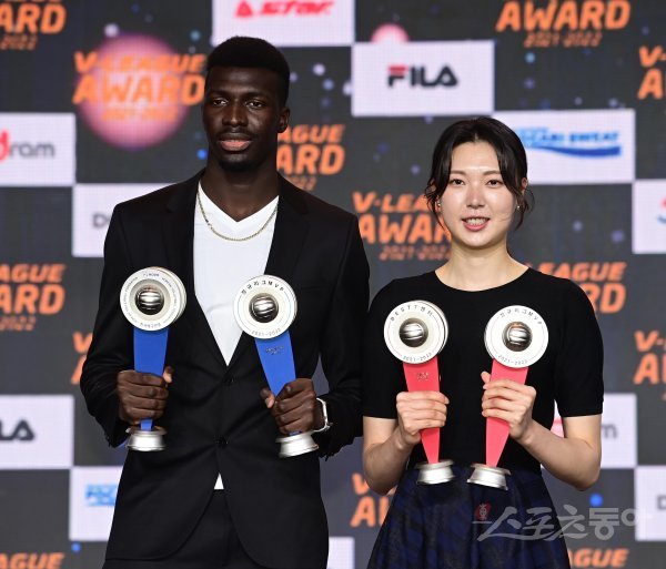 18일 서울 용산구 한남동 그랜드하얏트 서울에서 열린 ‘2021-2022 도드람 V리그 시상식’에서 남자부 정규리그 MVP KB손해보험 케이타와 여자부 정규리그 MVP 현대건설 양효진이 트로피를 들고 포즈를 취하고 있다. 용산 | 주현희 기자 teth1147@donga.com