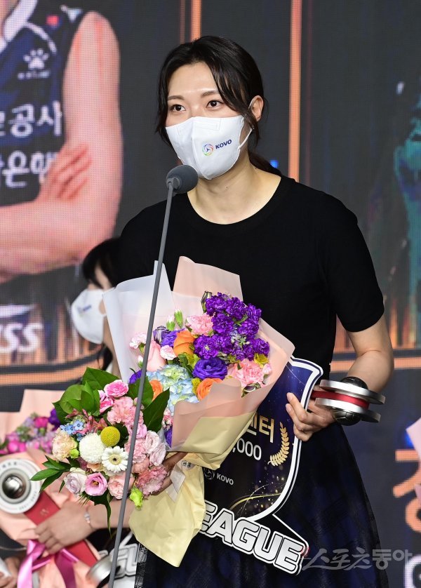 18일 서울 용산구 한남동 그랜드하얏트 서울에서 열린 ‘2021-2022 도드람 V리그 시상식’에서 현대건설 양효진이 여자부 베스트7으로 선정돼 소감을 말하고 있다.
