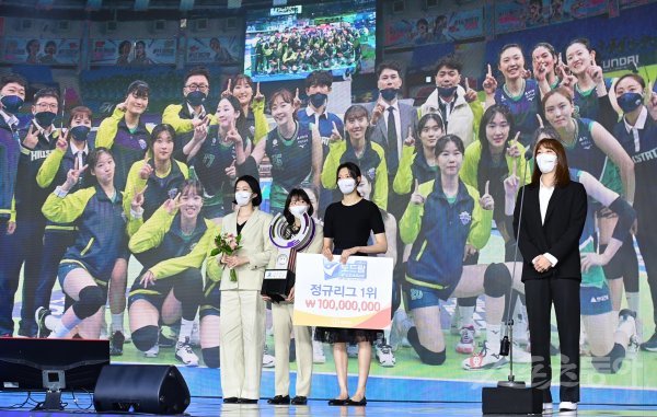 18일 서울 용산구 한남동 그랜드하얏트 서울에서 열린 ‘2021-2022 도드람 V리그 시상식’에서 현대건설 황민경이 여자부 정규리그 1위 트로피를 수상해 소감을 말하고 있다.