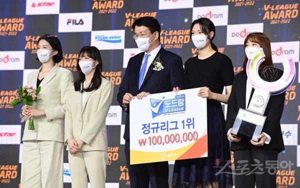 18일 서울 용산구 한남동 그랜드하얏트 서울에서 열린 ‘2021-2022 도드람 V리그 시상식’에서 현대건설 이다현, 김다인, 양효진, 황민경이 여자부 정규리그 1위 트로피를 수상해 조원태 총재와 기념 촬영을 하고 있다.