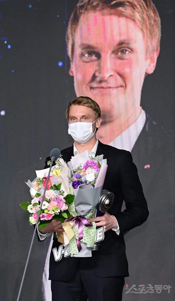 18일 서울 용산구 한남동 그랜드하얏트 서울에서 열린 ‘2021-2022 도드람 V리그 시상식’에서 대한항공 틸리카이넨 감독이 감독상을 수상해 소감을 말하고 있다.