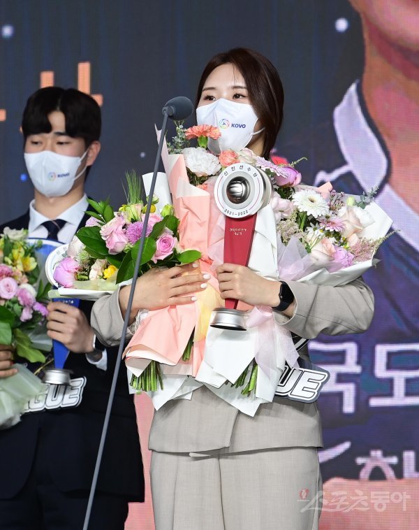 18일 서울 용산구 한남동 그랜드하얏트 서울에서 열린 ‘2021-2022 도드람 V리그 시상식’에서 현대건설 이윤정이 여자부 신인선수상을 수상해 소감을 말하고 있다.