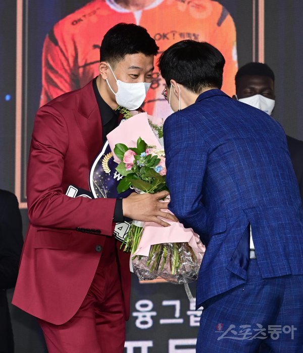 18일 서울 용산구 한남동 그랜드하얏트 서울에서 열린 ‘2021-2022 도드람 V리그 시상식’에서 한국전력 신영석이 남자부 베스트7으로 선정돼 동료로부터 축하 꽃다발을 받고 있다.