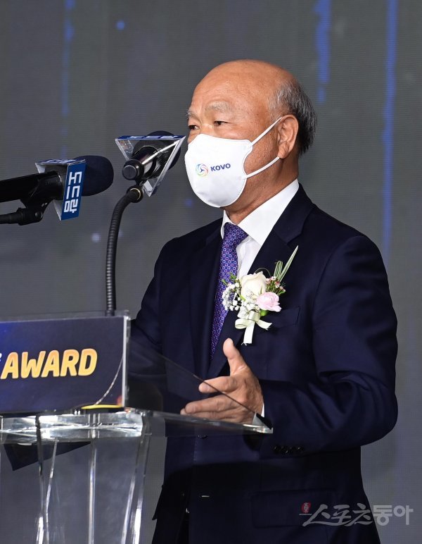 18일 서울 용산구 한남동 그랜드하얏트 서울에서 열린 ‘2021-2022 도드람 V리그 시상식’에서 박광욱 도드람양돈농협 조합장이 축사를 하고 있다.