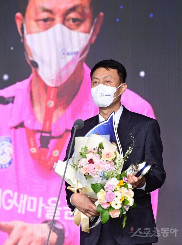 18일 서울 용산구 한남동 그랜드하얏트 서울에서 열린 ‘2021-2022 도드람 V리그 시상식’에서 남영수 심판이 심판상을 수상해 소감을 말하고 있다.