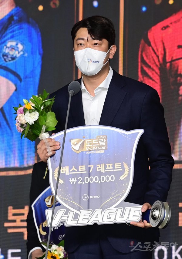 18일 서울 용산구 한남동 그랜드하얏트 서울에서 열린 ‘2021-2022 도드람 V리그 시상식’에서 우리카드 나경복이 남자부 베스트7으로 선정돼 소감을 말하고 있다.
