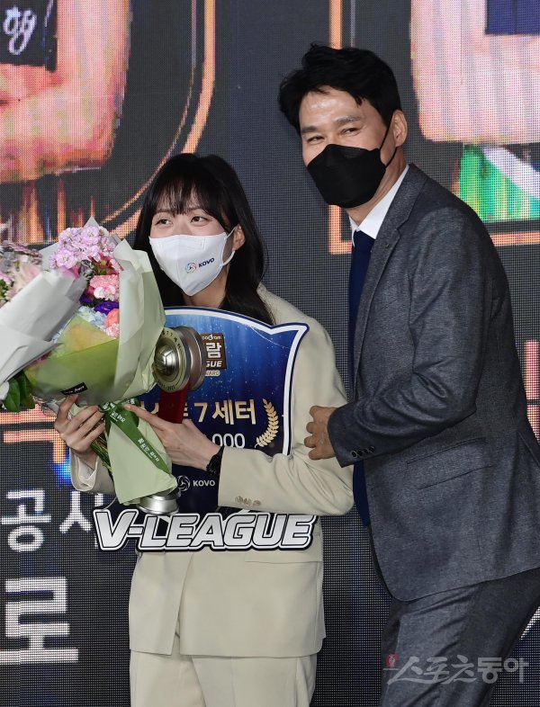18일 서울 용산구 한남동 그랜드하얏트 서울에서 열린 ‘2021-2022 도드람 V리그 시상식’에서 현대건설 김다인이 여자부 베스트7으로 선정돼 강성형 감독으로부터 축하 꽃다발을 받고 있다.