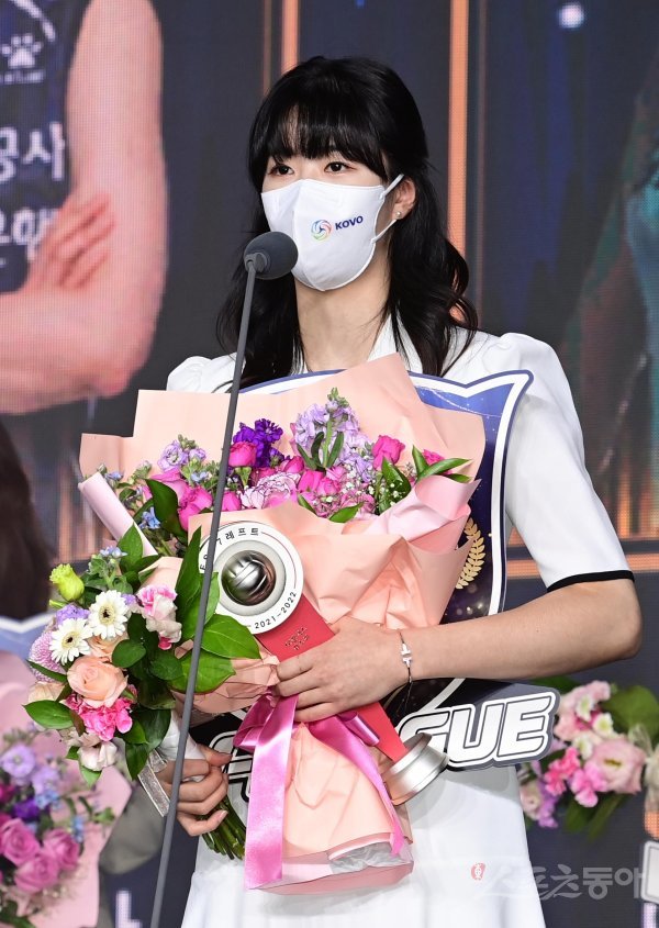 18일 서울 용산구 한남동 그랜드하얏트 서울에서 열린 ‘2021-2022 도드람 V리그 시상식’에서 GS칼텍스 강소휘가 여자부 베스트7으로 선정돼 소감을 말하고 있다.