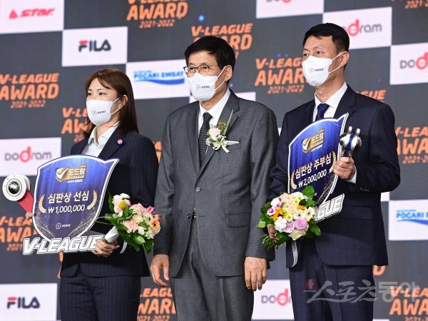 18일 서울 용산구 한남동 그랜드하얏트 서울에서 열린 ‘2021-2022 도드람 V리그 시상식’에서 심판상 선심 부문 곽미정 심판, 주부심 부문 남영수 심판이 김건태 경기운영본부장과 기념 촬영을 하고 있다.