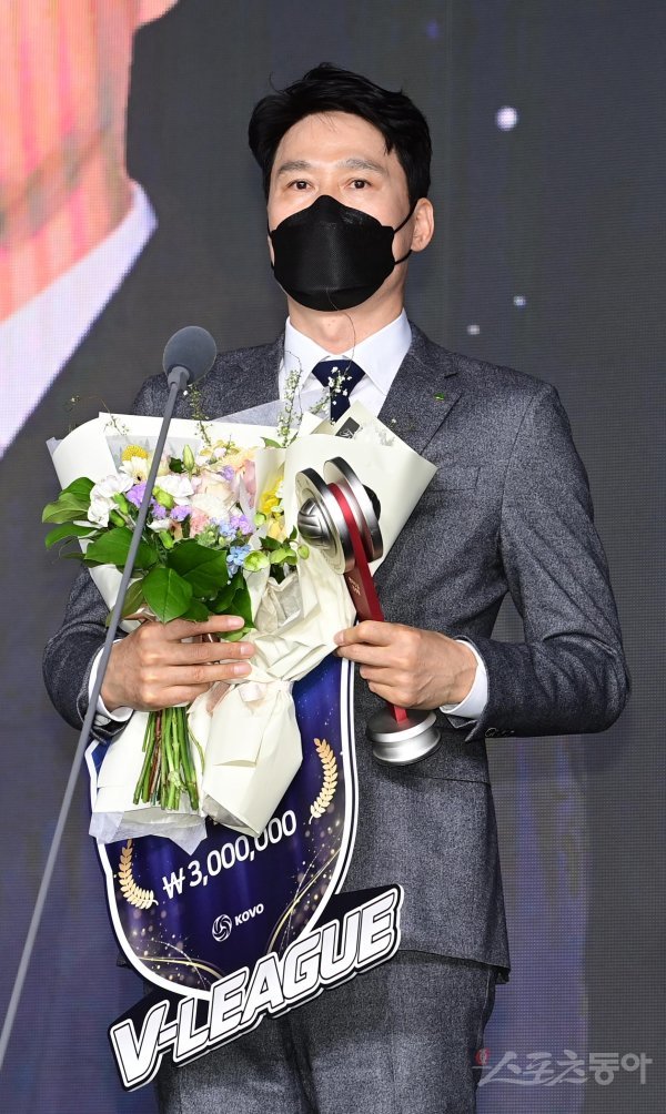 18일 서울 용산구 한남동 그랜드하얏트 서울에서 열린 ‘2021-2022 도드람 V리그 시상식’에서 강성형 감독이 감독상을 수상해 소감을 말하고 있다.
