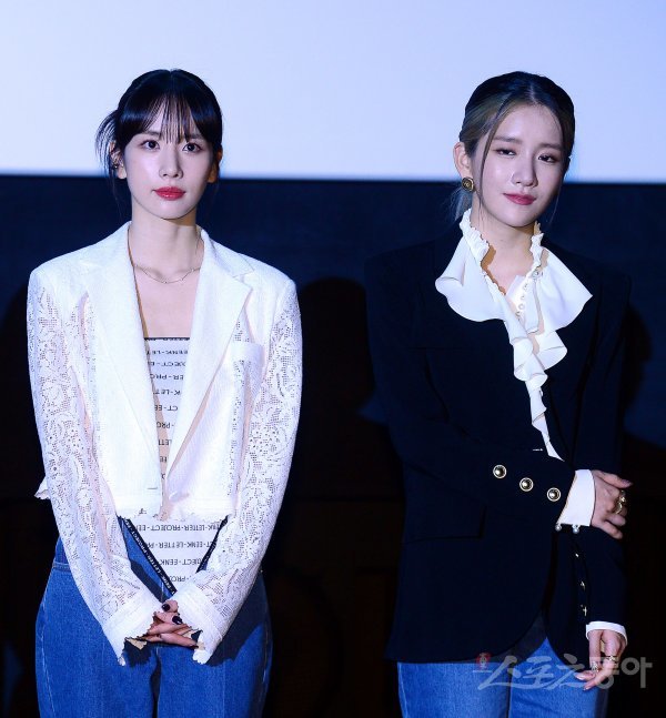 18일 오후 서울 강남구 코엑스 메가박스에서 열린 ‘서울괴담’ 언론시사회에 참석한 우주소녀 설아, 엑시가 무대 인사를 하고 있다.