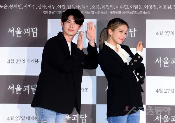 18일 오후 서울 강남구 코엑스 메가박스에서 열린 ‘서울괴담’ 언론시사회에 참석한 정원창과 우주소녀 엑시 포즈를 취하고 있다.