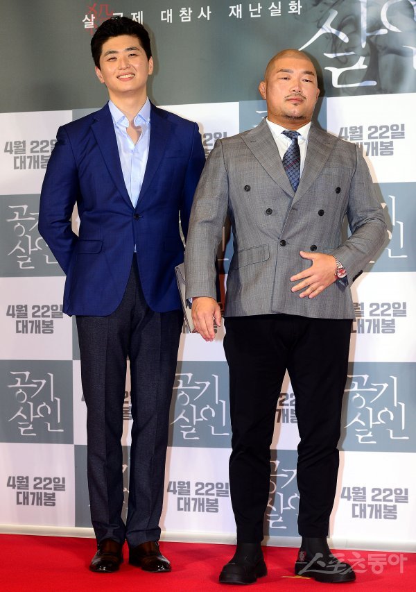 18일 오후 서울 용산구 CGV용산아이파크몰점에서 열린 영화 ‘공기살인’ VIP시사회에 참석한 소재원과 육진수가 포즈를 취하고 있다.