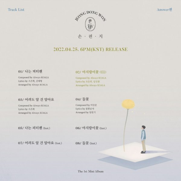 이어 18일 공개된 트랙리스트 Answer편에는 앞서 초성으로 궁금증을 모았던 곡명이 공개되어 관심을 집중시켰다. 타이틀 곡인 ‘아지랑이꽃’을 비롯해 ‘나는 피터팬’, ‘어려도 알 건 알아요’, ‘들꽃’ 등 정동원만이 보여줄 수 있는 소년미 가득한 곡명으로 컴백 기대감을 더욱 고조시켰다.