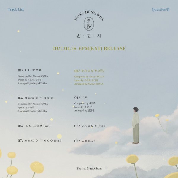 지난 17일 공개된 트랙리스트 Question편은 한 편의 동화를 연상시키는 일러스트 위에 초성으로 표기된 곡 제목이 눈길을 모은다. 2번 트랙에 수록된 타이틀 곡을 비롯해 4곡 모두 초성으로 표기되어 팬들의 호기심을 자극했다.