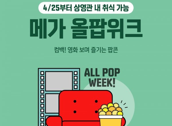 오랫동안 기다려 온 상영관 내 취식 허용을 환영하는 의미를 담아 메가박스는 매점에서 즐길 수 있는 다양한 이벤트를 선보인다. 메가 올팝위크 이벤트에 관한 자세한 내용은 메가박스 홈페이지 및 모바일 앱에서 확인할 수 있다.