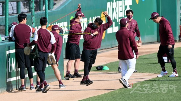 19일 인천 SSG 랜더스필드에서 ‘2022 신한은행 SOL KBO리그’ SSG 랜더스와 키움 히어로즈의 경기가 열린다. 경기 전 키움 선수들이 스트레칭 훈련을 하고 있다.
