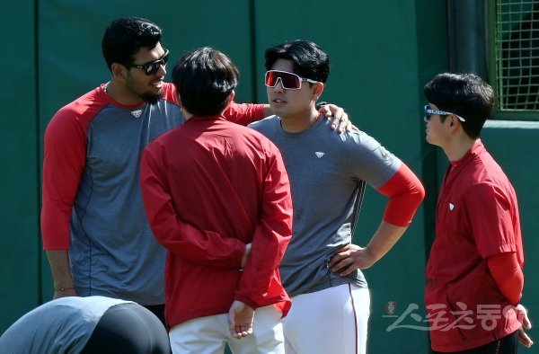 19일 인천 SSG 랜더스필드에서 ‘2022 신한은행 SOL KBO리그’ SSG 랜더스와 키움 히어로즈의 경기가 열린다. 경기 전 SSG 폰트와 김택형이 이야기를 나누고 있다.