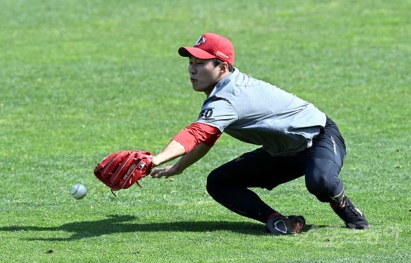 19일 인천 SSG 랜더스필드에서 ‘2022 신한은행 SOL KBO리그’ SSG 랜더스와 키움 히어로즈의 경기가 열린다. 경기 전 SSG 최민준이 투수 수비훈련을 하고 있다.