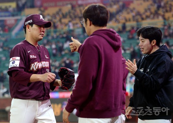 19일 인천 SSG 랜더스필드에서 ‘2022 신한은행 SOL KBO리그’ SSG 랜더스와 키움 히어로즈의 경기가 열렸다. 5회까지 SSG 공격을 1실점으로 막은 키움 선발 정찬헌이 이닝 종료 후 동료들의 환영을 받고 있다.