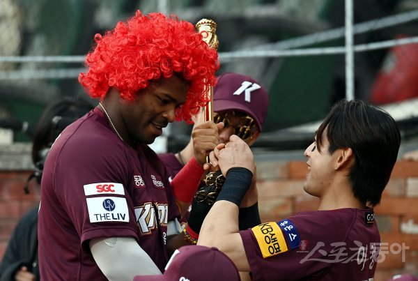 19일 인천 SSG 랜더스필드에서 ‘2022 신한은행 SOL KBO리그’ SSG 랜더스와 키움 히어로즈의 경기가 열렸다. 2회초 무사에서 키움 푸이그가 솔로 홈런을 쏘아 올린 후 이정후로부터 가발 장식을 전달받고 있다.