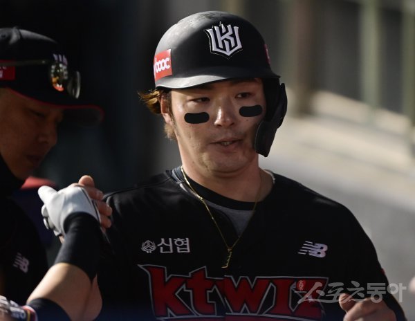 19일 서울 잠실야구장에서 열린 ‘2022 신한은행 SOL KBO리그’ LG 트윈스와 KT 위즈의 경기에서 5회초 1사 2, 3루 KT의 우전 적시타 때 3루주자 박병호가 득점에 성공한 후 더그아웃에서 동료들의 축하를 받고 있다.
