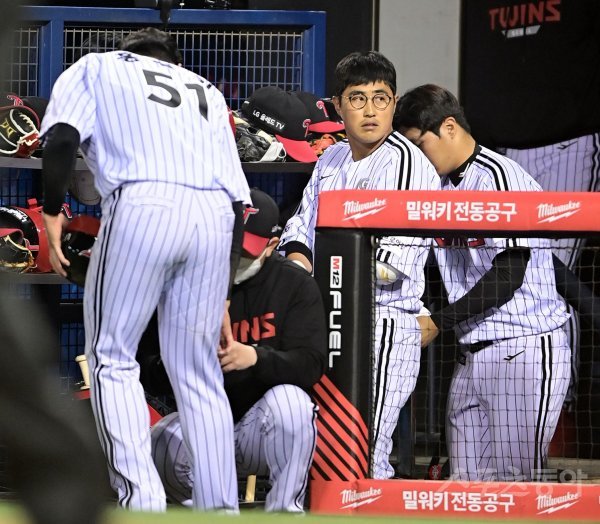 19일 서울 잠실야구장에서 열린 ‘2022 신한은행 SOL KBO리그’ LG 트윈스와 KT 위즈의 경기에서 6회말 2사 만루 LG 채은성이 유격수 정면 타구로 아웃된 뒤 더그아웃에서 아쉬워하고 있다.