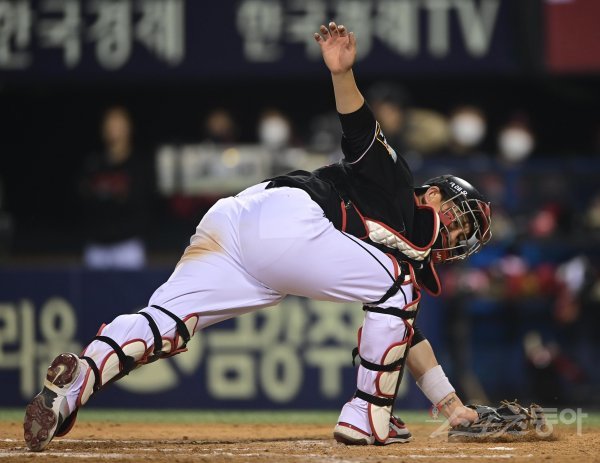 19일 서울 잠실야구장에서 열린 ‘2022 신한은행 SOL KBO리그’ LG 트윈스와 KT 위즈의 경기에서 6회말 1사 만루 LG의 내야 땅볼 때 KT 장성우가 3루주자를 포스 아웃시키고 있다.