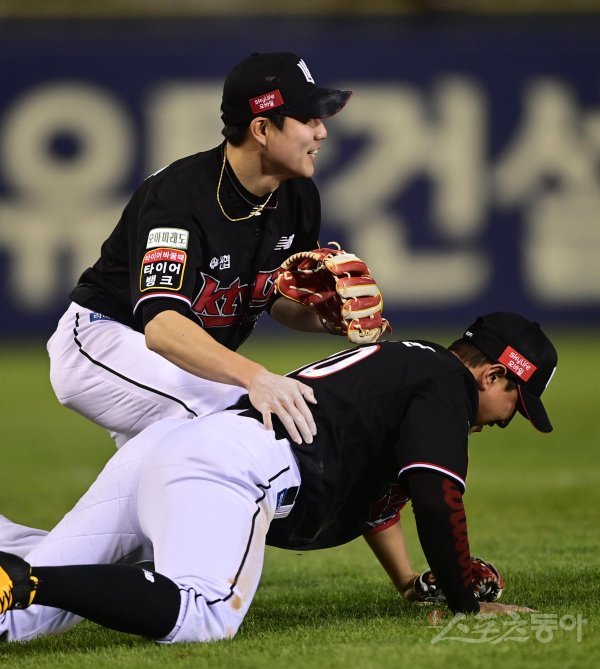19일 서울 잠실야구장에서 열린 ‘2022 신한은행 SOL KBO리그’ LG 트윈스와 KT 위즈의 경기에서 7회초 1사 LG의 파울 타구를 잡은 KT 심우준과 황재균이 일어서며 웃고 있다.